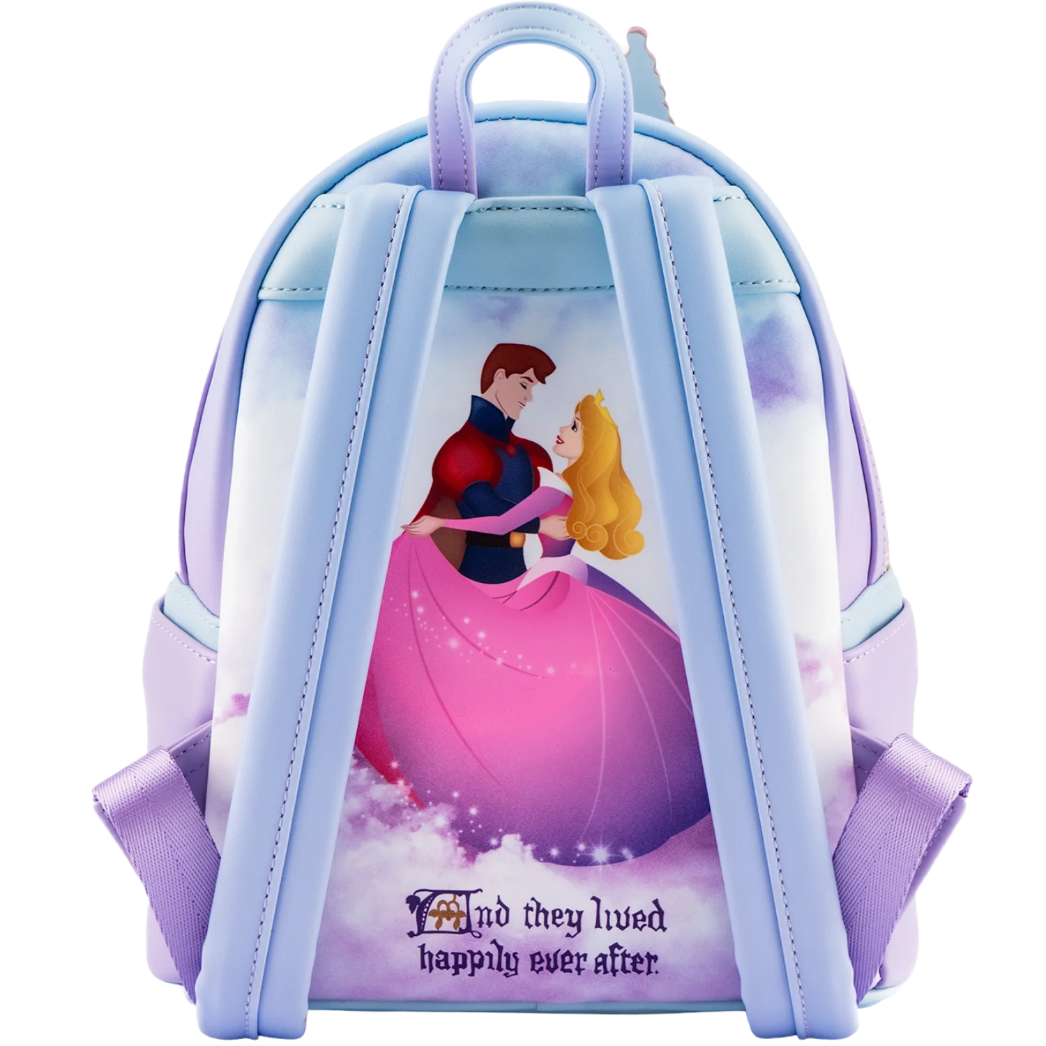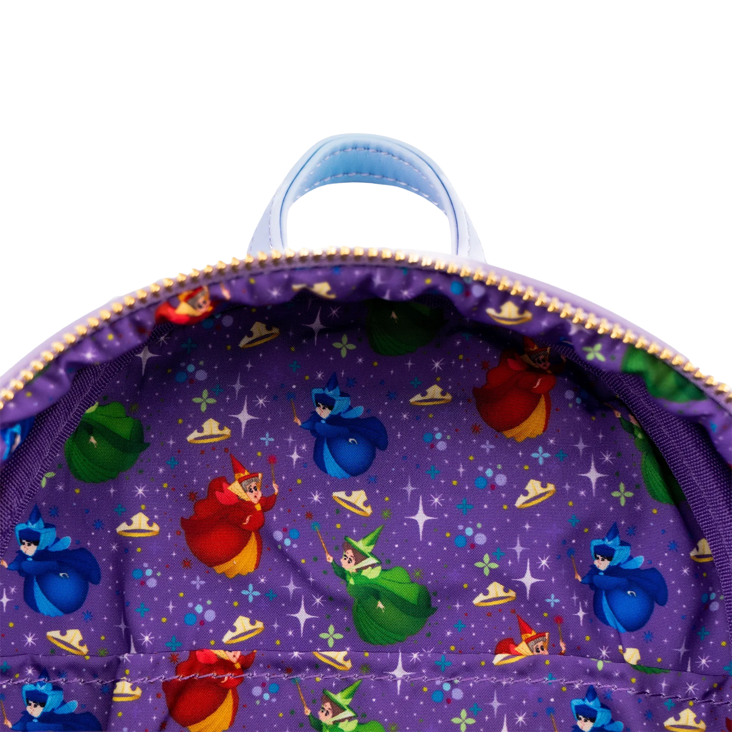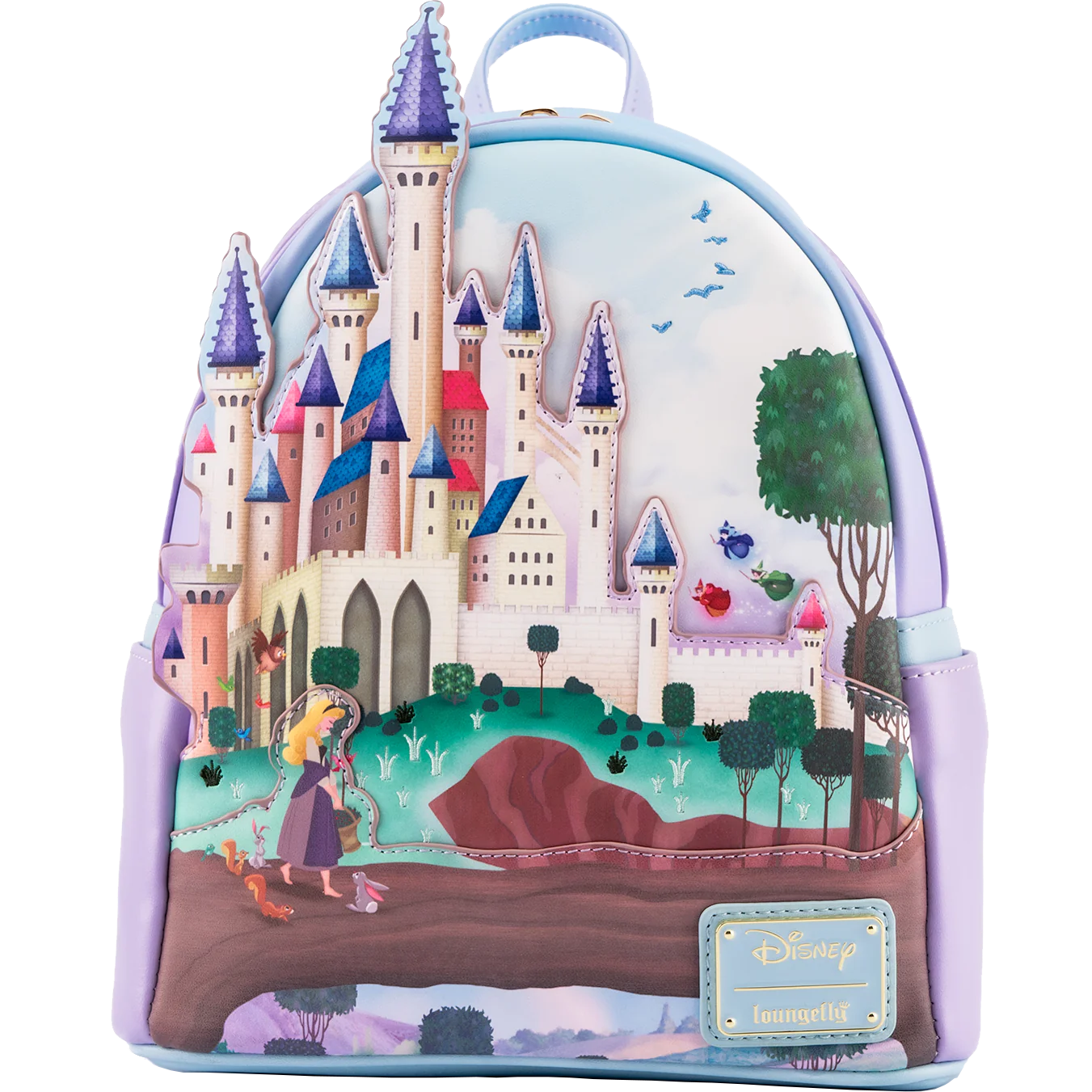 Add onto your Loungefly castle series collection with this Loungefly Disney Princess Sleeping Beauty Castle Series Mini Backpack. Featuring classic scenes on the front and back with applique, embroidered, and printed details on a faux leather base.