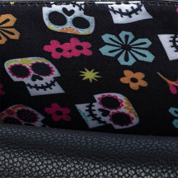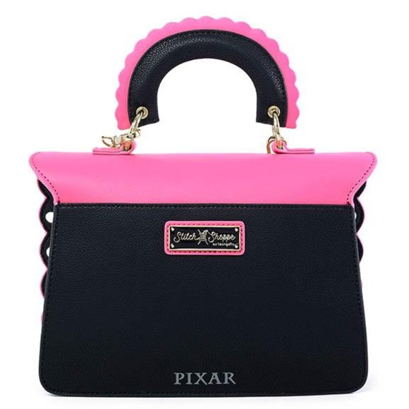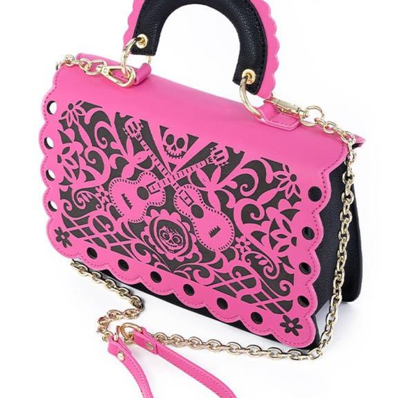 This genuine leather cross-body bag includes a faux leather laser cut scalloped front flap and trims, debossed print, interior lining, metal chain strap, and plaque details. This bag comes with an exclusive enamel pin that is only available with this Coco Stitch Shoppe by Loungefly collection.