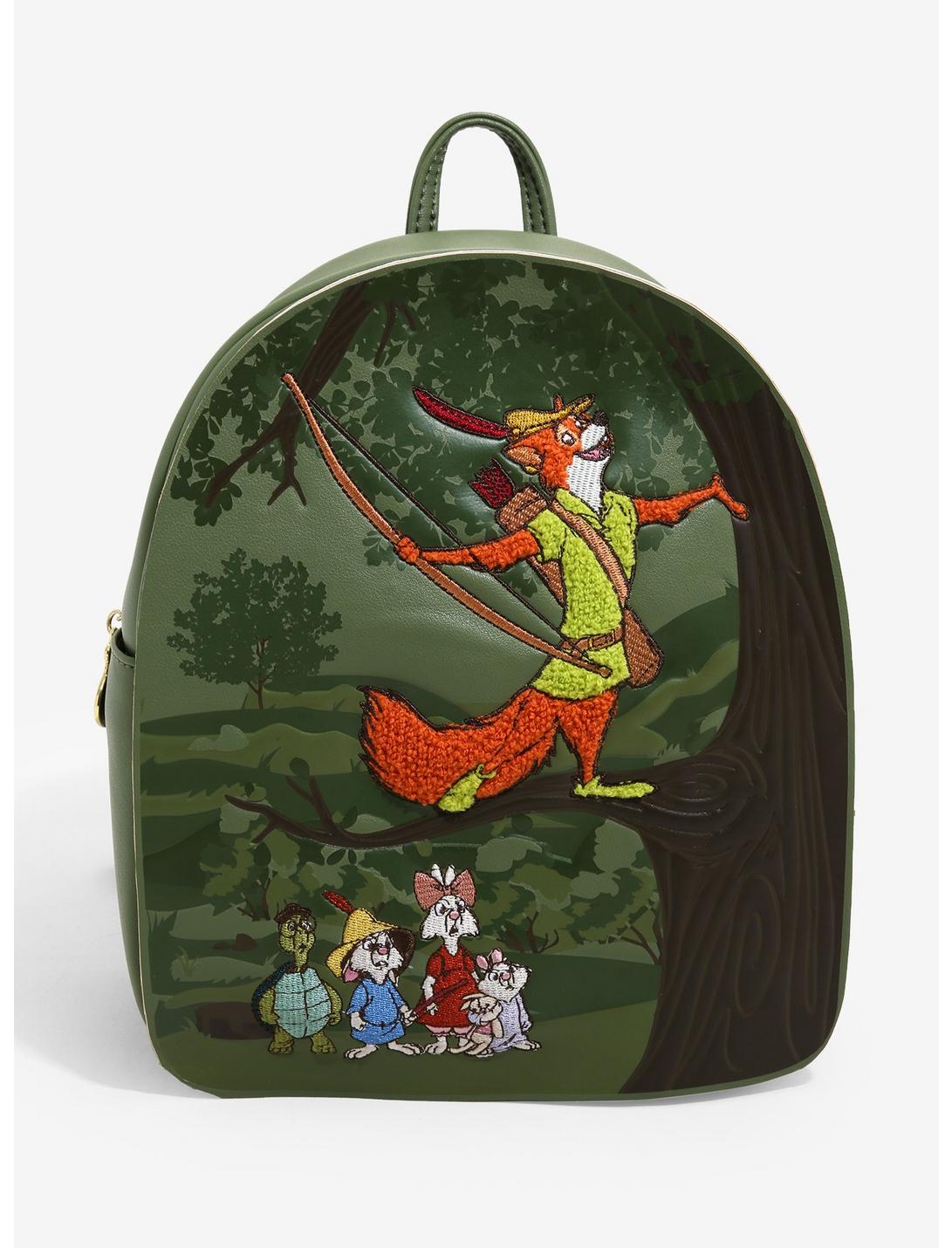 Ooh de lally! Robin Hood, Little John, and his band of Merry Men are more than happy to join you on your adventures! Inspired by Disney's Robin Hood, this faux leather Loungefly mini backpack features embroidered characters and debossed details on the exterior—including a chenille Robin Hood patch. Additional details include a main zip compartment, interior zip pocket, interior lining with an allover quote and icon pattern, two side pockets, gold tone hardware, and adjustable straps.