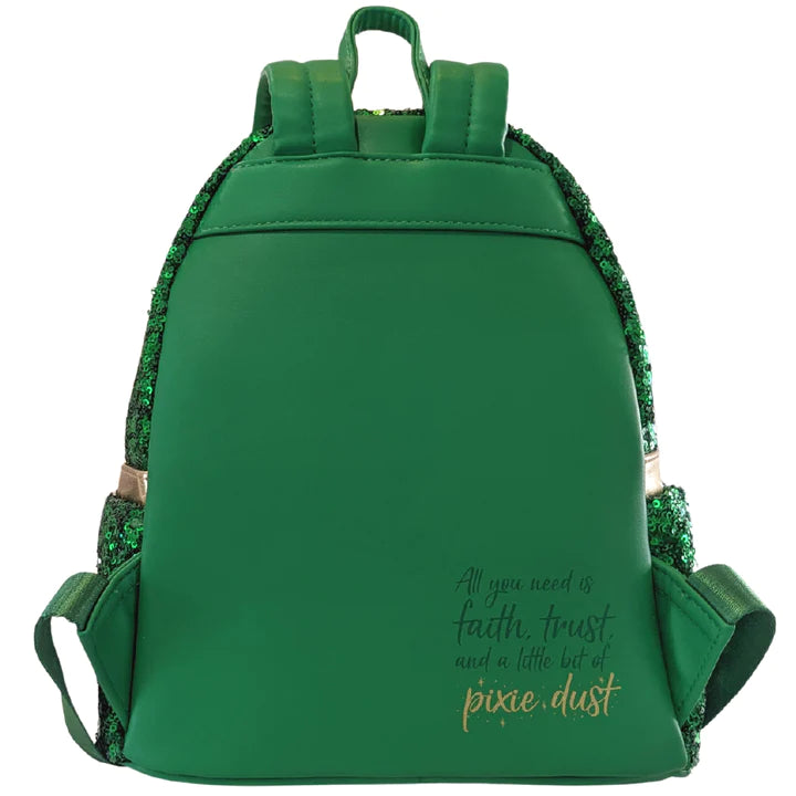 All you need is faith, trust and this adorable Loungefly Disney Tinkerbell Green Sequin Mini Backpack, featuring printed and debossed details, shiny gold hardware, a front zip pocket, 2 side pockets, bow with wings, and sequins galore!