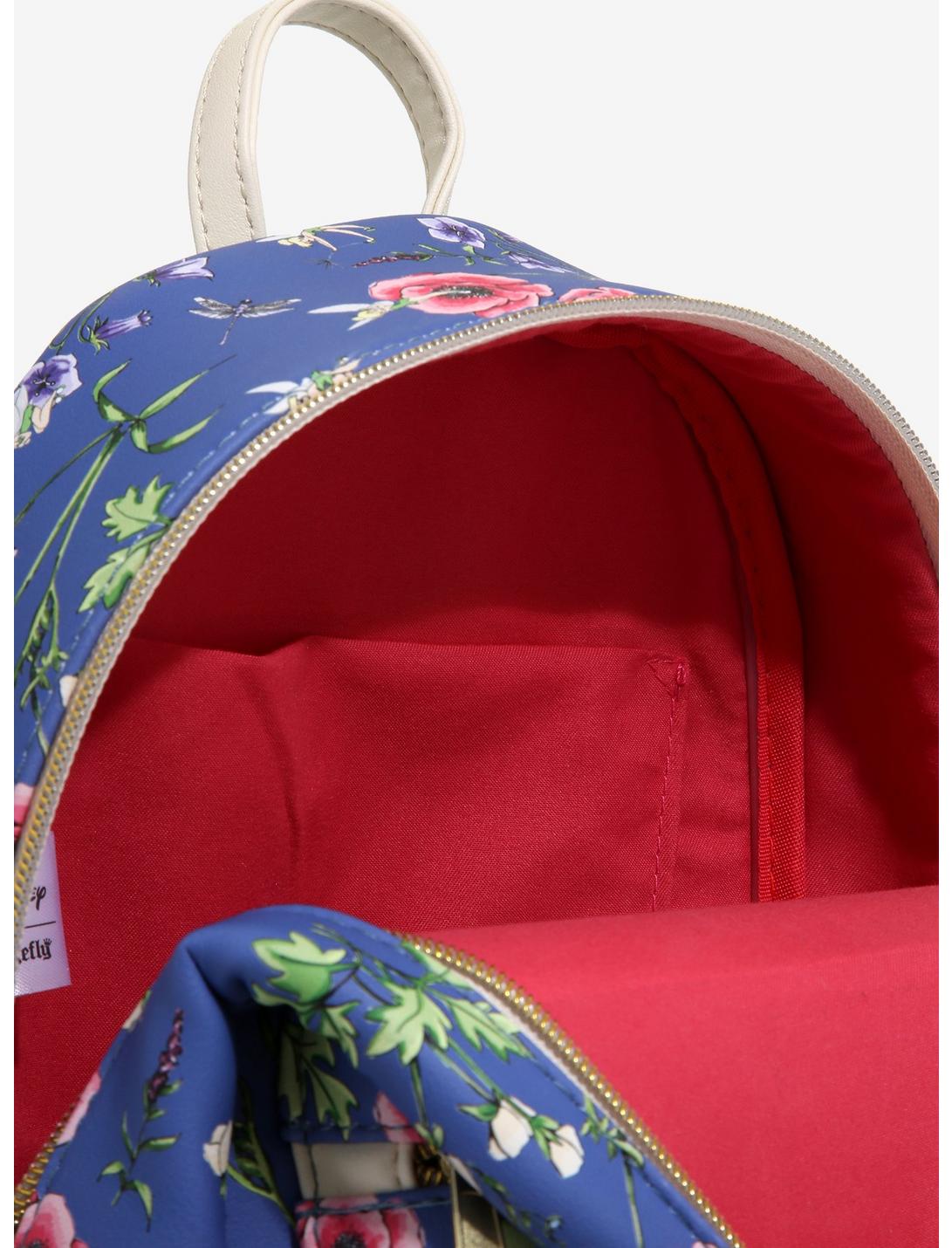 Keep your things close as you fly through the Never Land sky with Tink. This faux leather mini backpack features a floral print with Tinker Bell. Adjustable straps, front zipper pocket and interior drop pocket.
