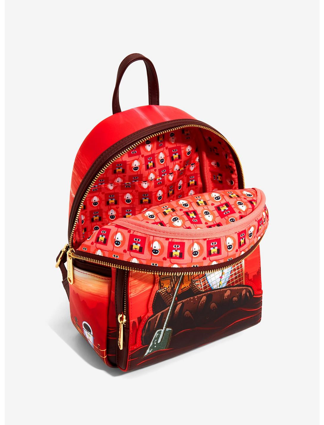 The Loungefly Pixar Moments WALL-E Date Night Mini Backpack is made of vegan leather (polyurethane). Bag has adjustable shoulder straps and sturdy metal hardware. Additional features include applique and printed details. Take note of the coordinating inside lining.