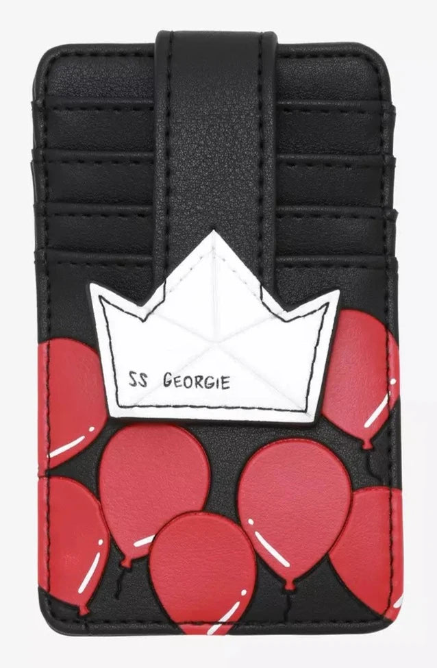 . Featuring red balloons on a black background and a snap closure with the S.S Georgie. Includes 4 card slots and a clear ID window that has "You'll float too" printed above.