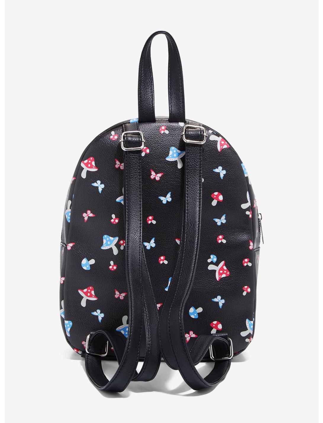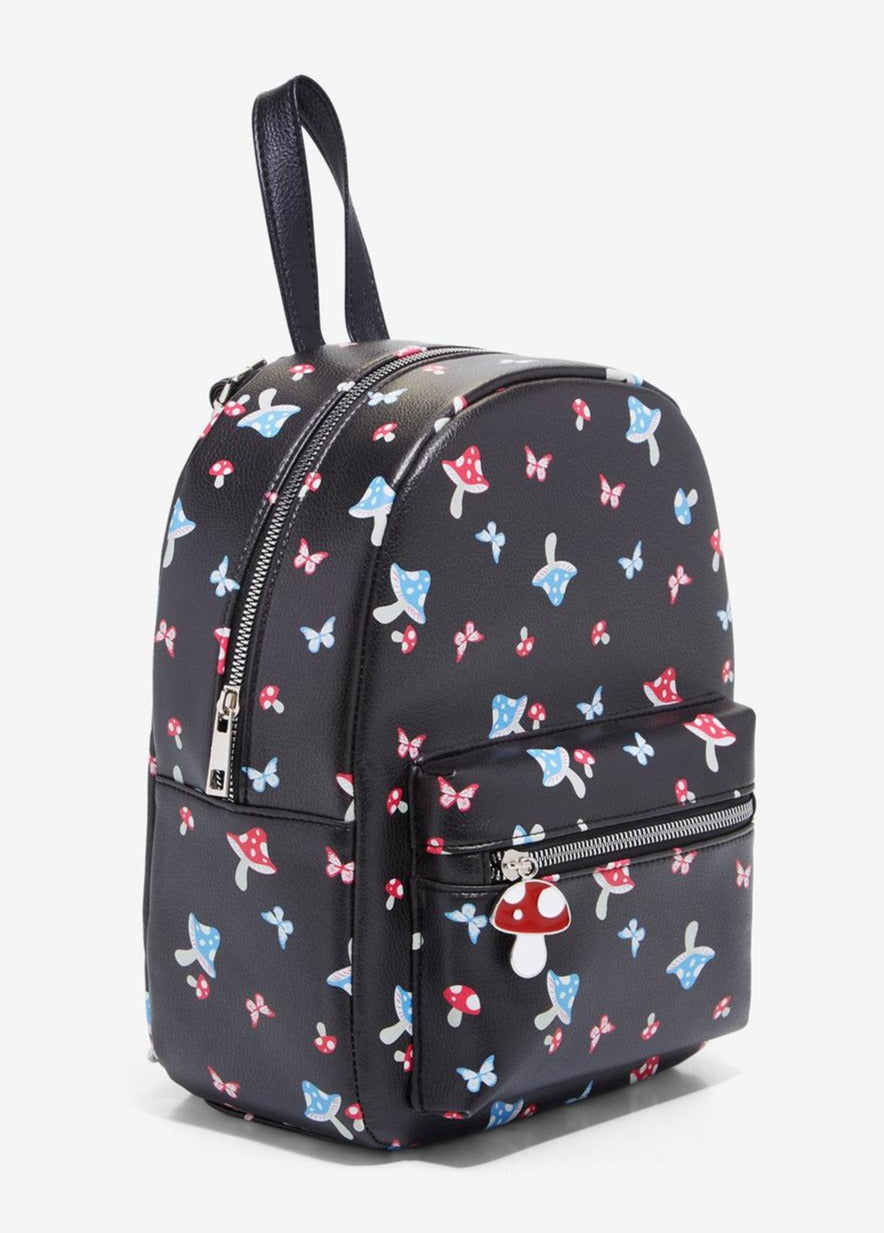 We've got the perfect backpack for your next romp in the forest! Feel one with nature with this mini faux leather backpack, featuring an allover whimsical print of red and blue butterflies and mushrooms. Comes with a toadstool charm on the front zipper pocket, adjustable straps and interior zipper pocket.
