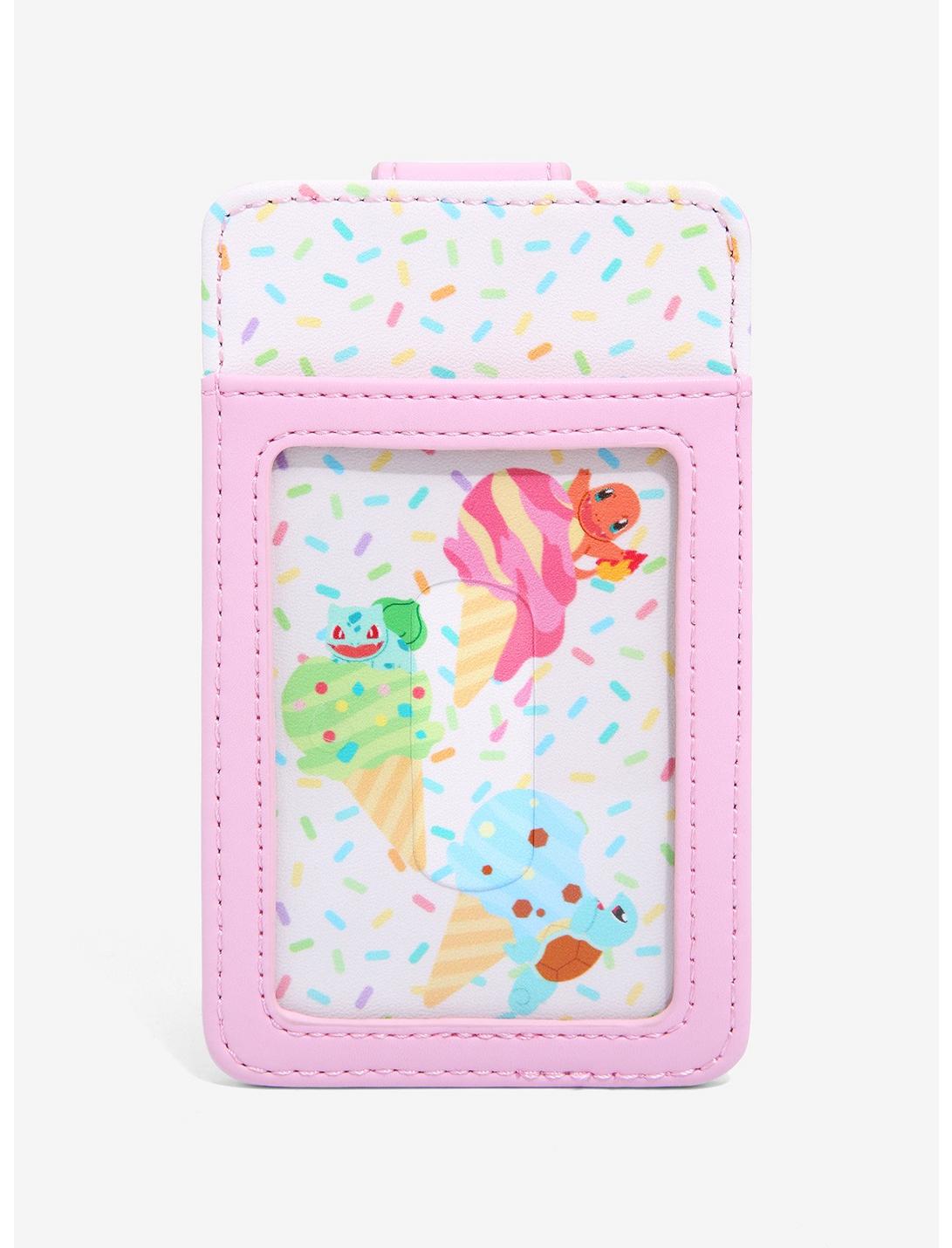 This sweet accessory features Pikachu with an ice cream cone on the snap button closure and his fellow Pokemon, Charmander, Bulbasaur, and Squirtle, in the clear ID sleeve. Keep all your important Poke Cards safe in the multiple card slots that features a sprinkle pattern.