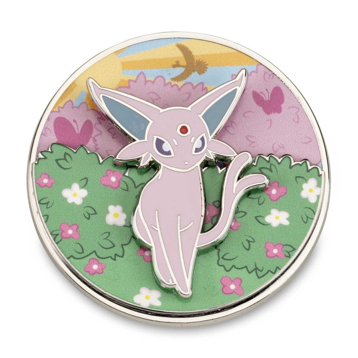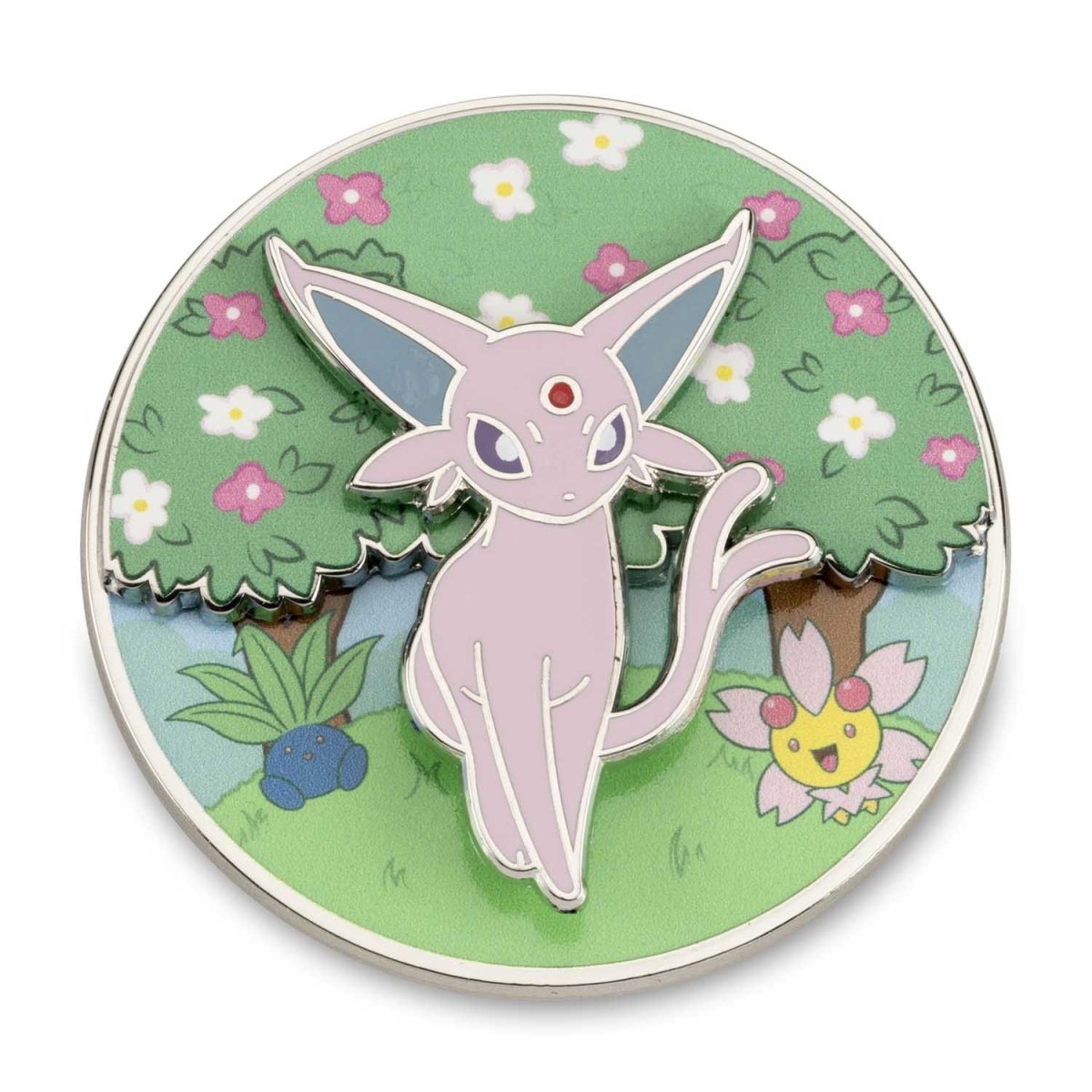Espeon is basking in the sun with its friends on this Pokemon Spinning Scenes Pin. Spinning the pin around will reveal other Pokemon, such as Oddish and Cherrim in its Sunshine Form, as well as a beautiful forest filled with colorful cherry blossoms. Just spin the pin when you want to change the scene!