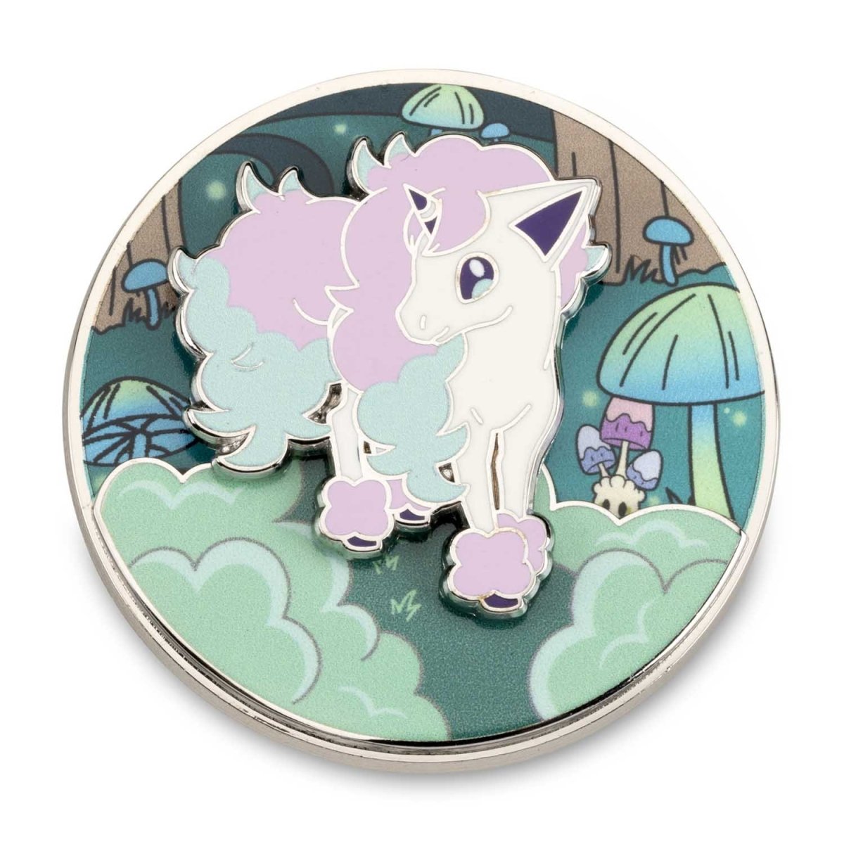Galarian Ponyta strolls through the mushroom-filled Glimwood Tangle on this Pokemon Spinning Pin! By spinning the pin around, you'll see other Pokemon like Morelull and Sinistea peeking through the grass. Just spin the pin when you want to change the scene!