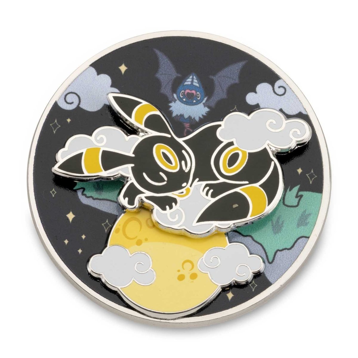 Umbreon is snoozing underneath the night sky on this Pokemon Spinning Scenes Pin. As the night progresses, you'll see other Pokemon flying around, like Zubat and Swoobat. Just spin the pin when you want to change the scene!