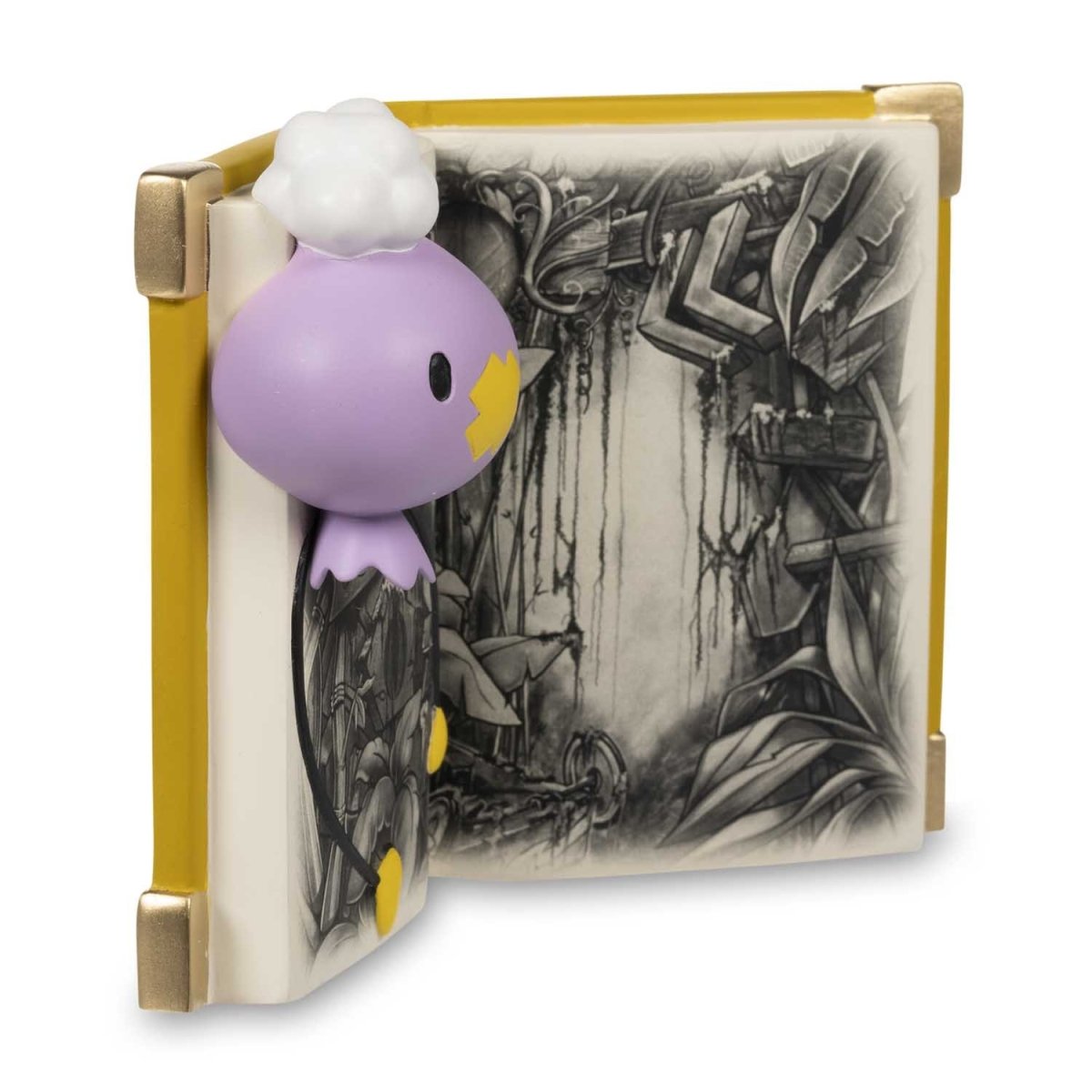 The Pokémon Scary Stories: Story of Drifloon Figure features Drifloon floating in front of a yellow storybook depicting an abandoned playhouse illustrated by Vic Lee. Drifloon seeks out children, often tugging on their hands when trying to make friends with them. However, it gets pulled around instead. This Drifloon figure stays in one place and will go best with other spooky decor or on a bookshelf.