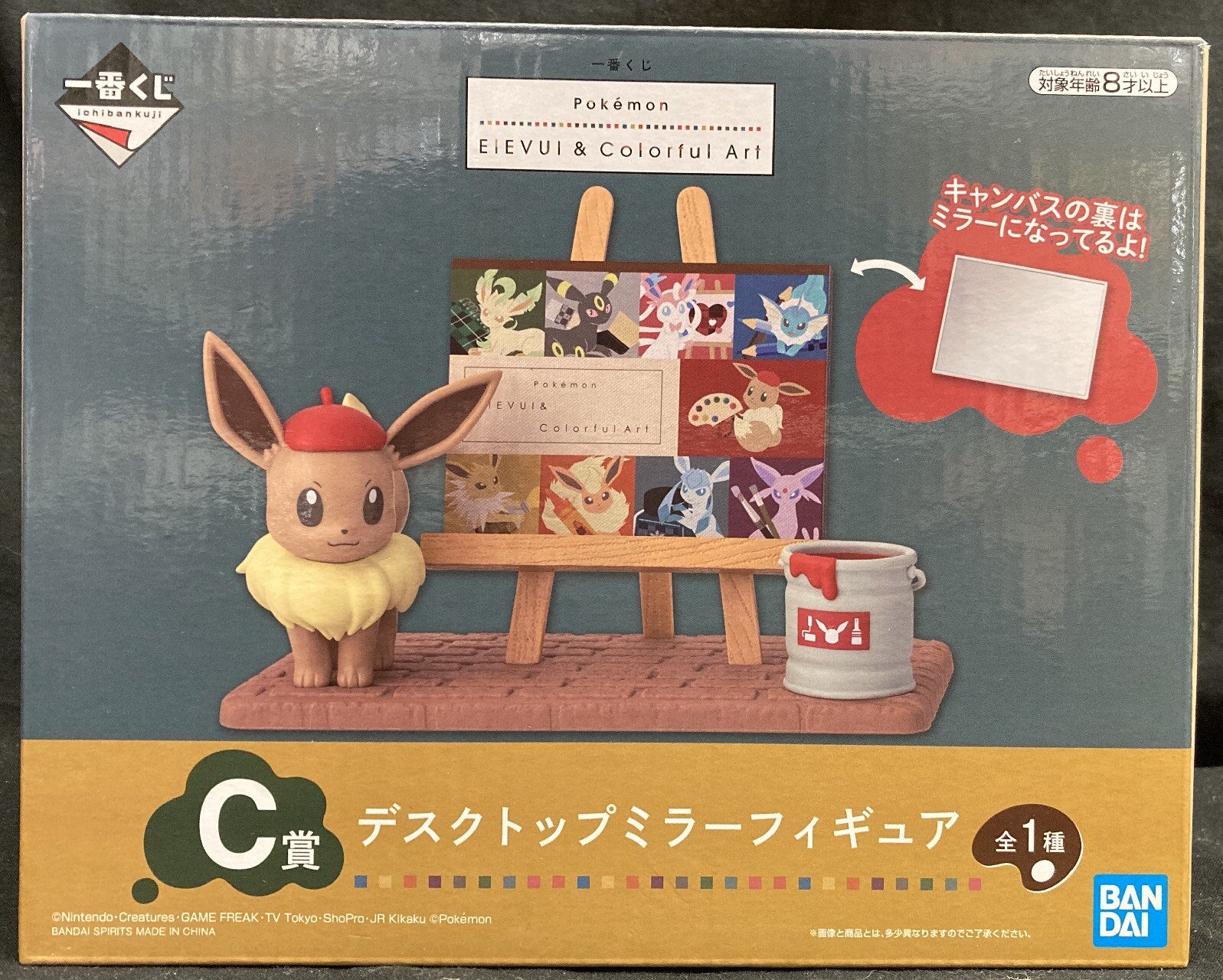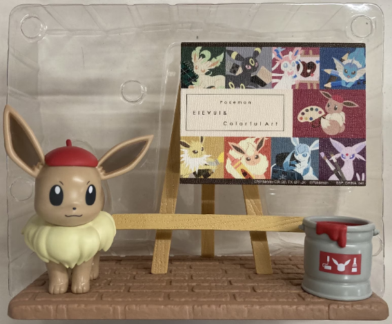 From the Pokemon Eevee & Colorful art Ichiban Kuji, this is prize C! This figure features Eevee with an easel and bucket of paint. On the easel, is a reversible painting! The front has illustrations of all the Eevee evolutions, and the reverse is a mirror for you to use!