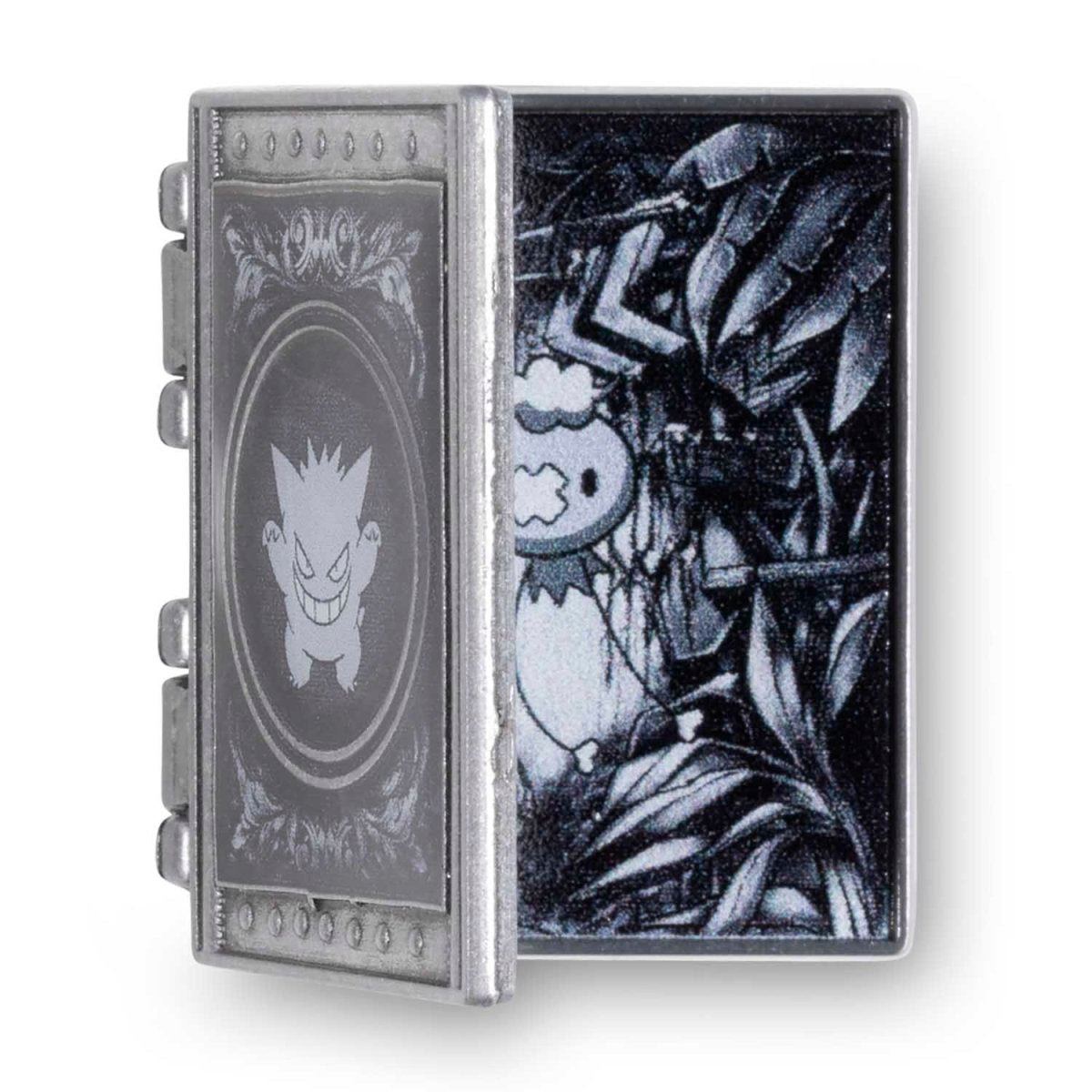 Featuring a unique storybook design with a slightly antiqued look, this hinged metal and enamel pin depicts a grinning Gengar on the cover and Vic Lee's Story of Drifloon illustration on the inside. Wear it on your lapel or lanyard for an interactive touch of spooky Pokemon style.