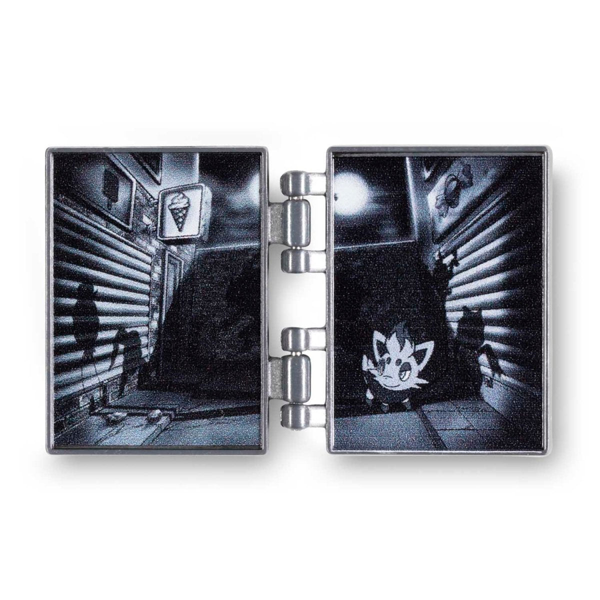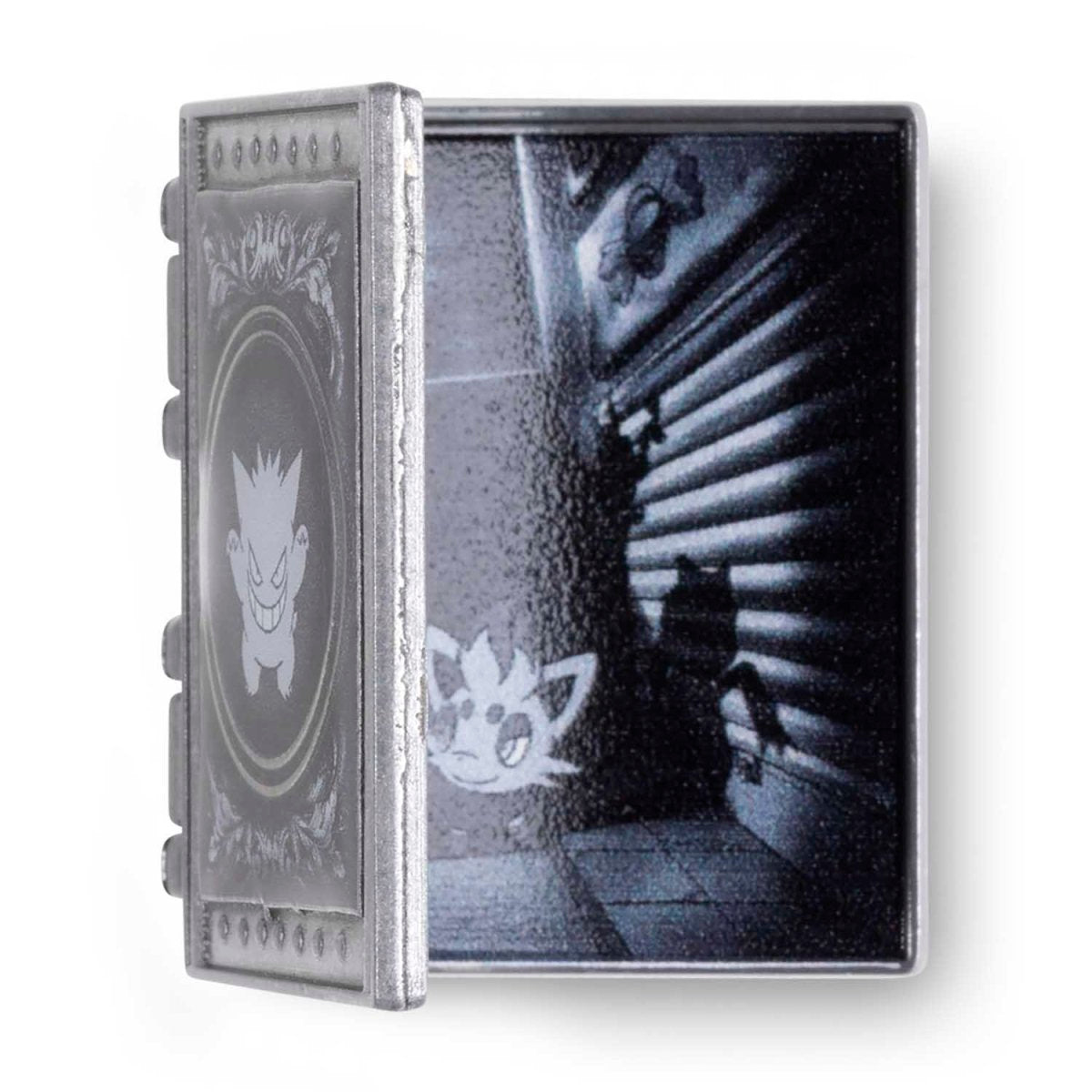 Featuring a unique storybook design with a slightly antiqued look, this hinged metal and enamel pin depicts a grinning Gengar on the cover and Vic Lee's Story of Zorua illustration on the inside. Wear it on your lapel or lanyard for an interactive touch of spooky Pokemon style.