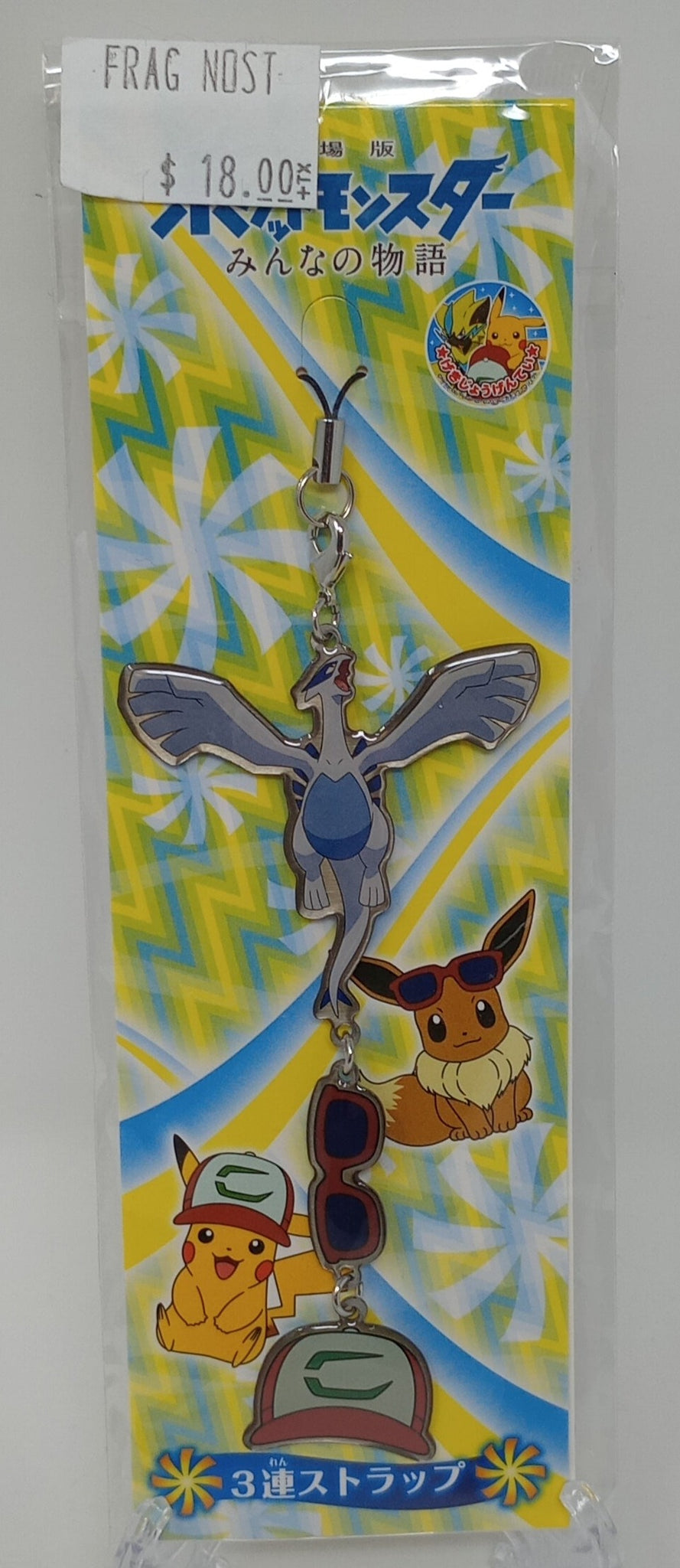 This 3 charm keychain was made by Movic for Pokémon the Movie: The Power of Us. It features Lugia, the pair of sunglasses worn by Eevee, and the hat worn by Pikachu.