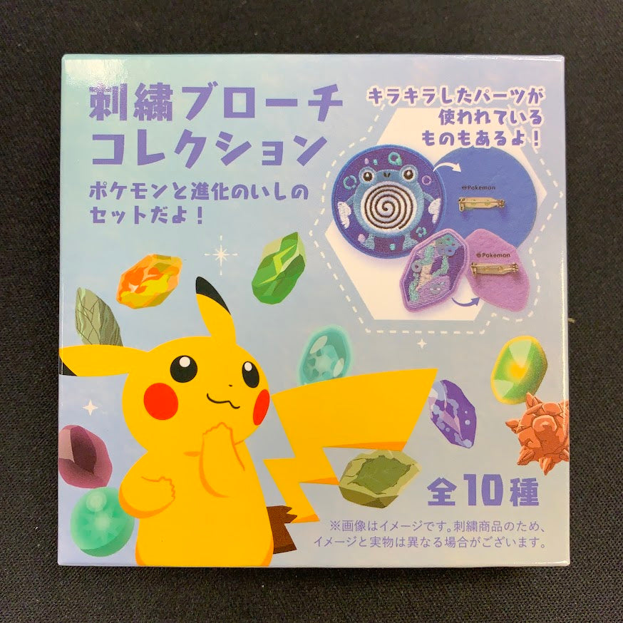 Each mystery box comes with a pair of Embroidered fabric brooch pins. The pins display an icon of an adorable Pokemon alongside their evolution stone.