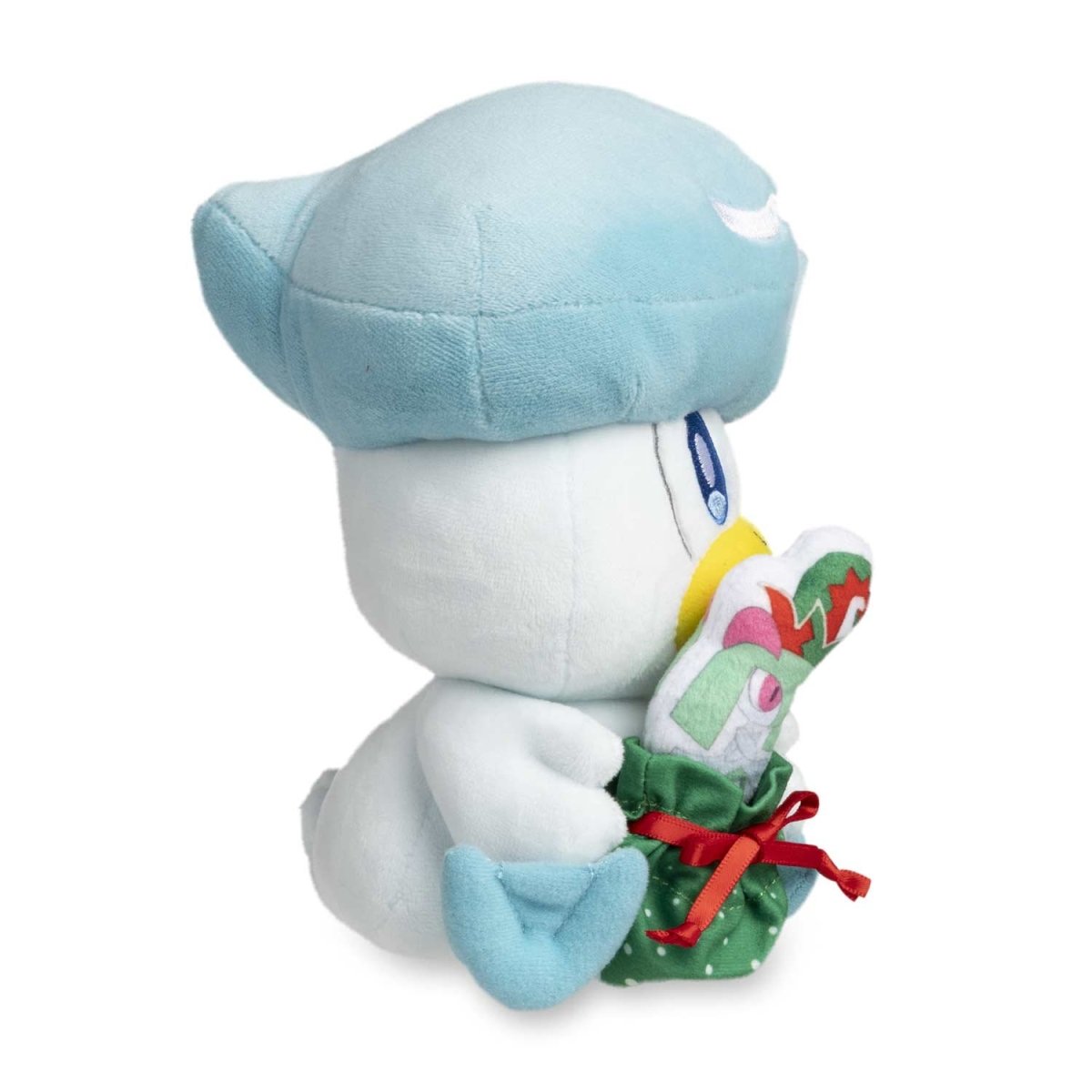 Celebrate the season with a new plush friend—Quaxly! The Duckling Pokemon is holding a festive, ribbon-tied bag with a removable Kirlia plush inside, making this plush perfect for gifting or showing off on a bookshelf or mantel.
