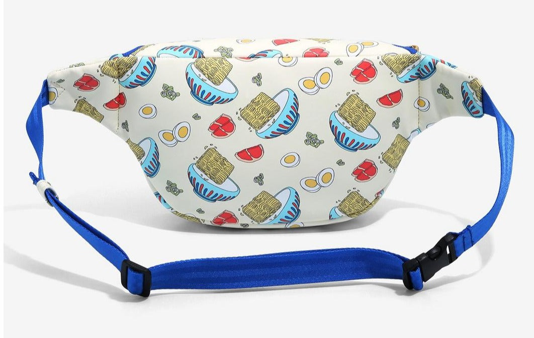 Take Ponyo with you on your next foodie adventure with this Studio Ghibli fanny pack! The lovable goldfish princess poses on this bag's front pocket, ready to dig into a delicious bowl of ramen. With an allover print canvas of eggs, chashu pork, and other ramen ingredients, this accessory is perfect for carrying spare utensils, restaurant gift cards, and other necessities. Also features a nautical-themed interior lining pattern, an adjustable strap, gold-toned hardware, an enamel brand badge, and a chashu pork enamel zipper pull.