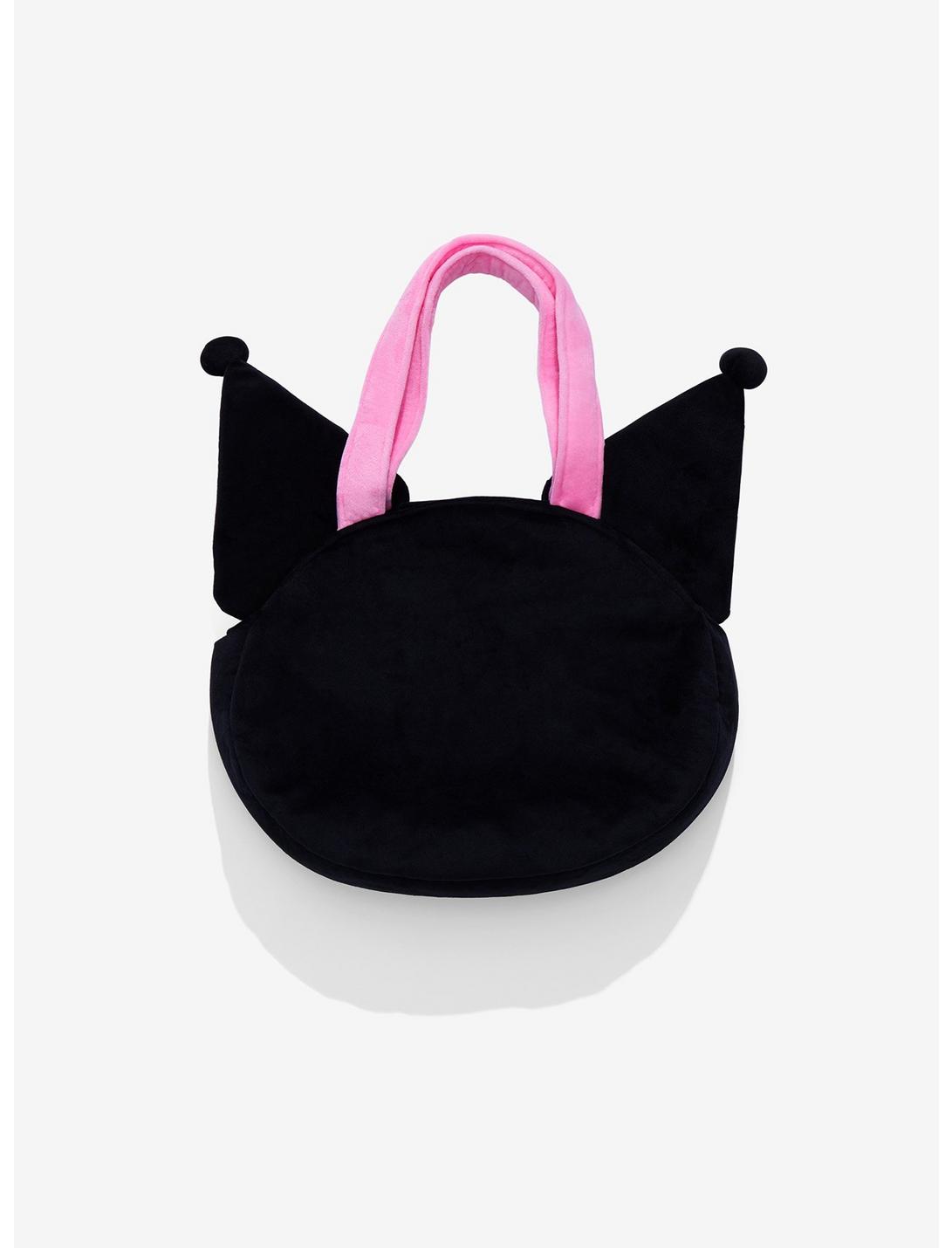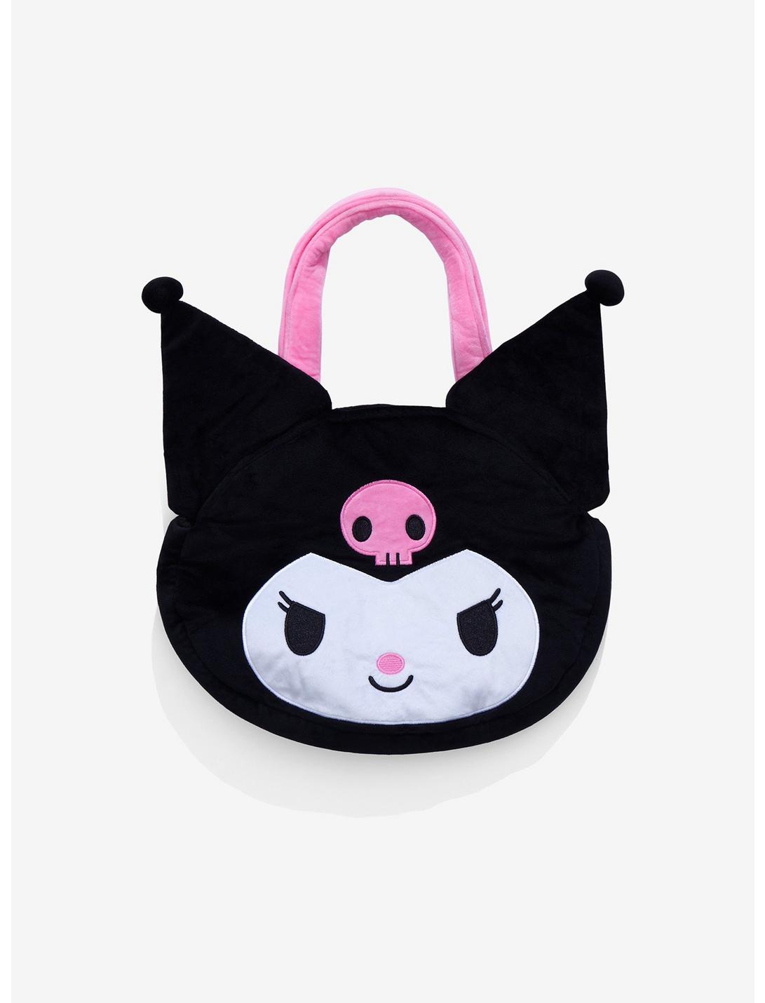 Hit the town and cause some mischief with your Sanrio bestie! Carry all of your essentials in this devilishly cute tote bag, featuring a design depicting Kuromi's face. Comes with 3D detailing of her ears, contrast pink straps, an interior drop pocket and a snap-button closure.