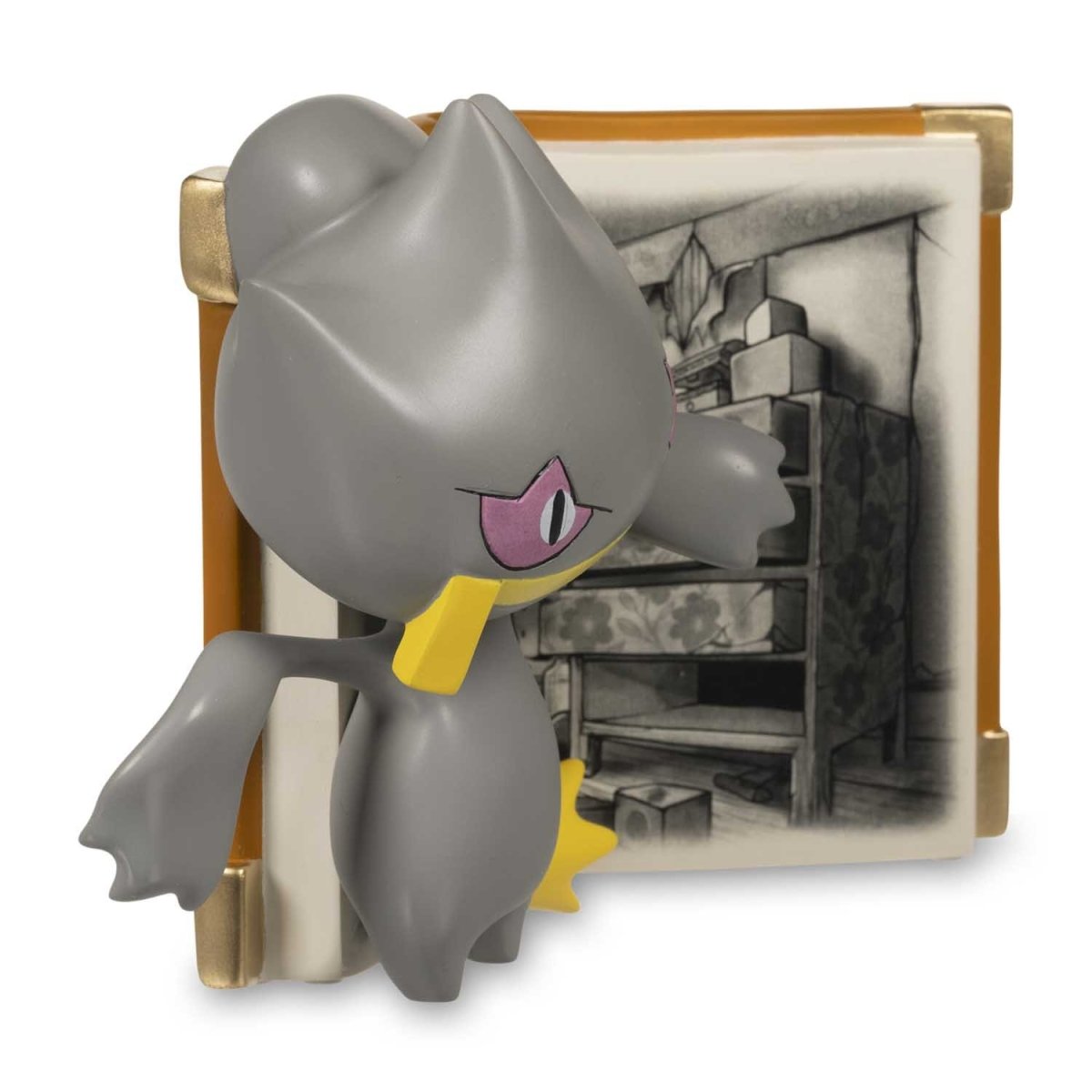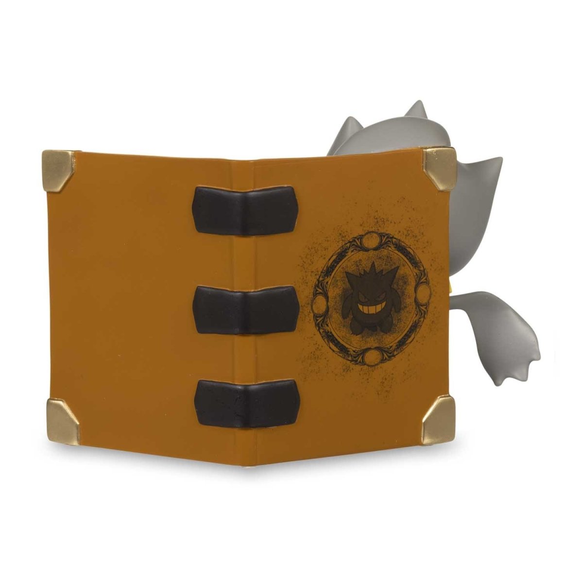 The Pokémon Scary Stories: Story of Banette Figure features Banette standing in front of an orange storybook displaying a forgotten bedroom illustrated by Vic Lee. It is said that Banette was a doll that became a Pokémon over its grudge from being thrown away. Some say that treating it well will satisfy it—so display it with your other spooky decor on a shelf or nightstand!