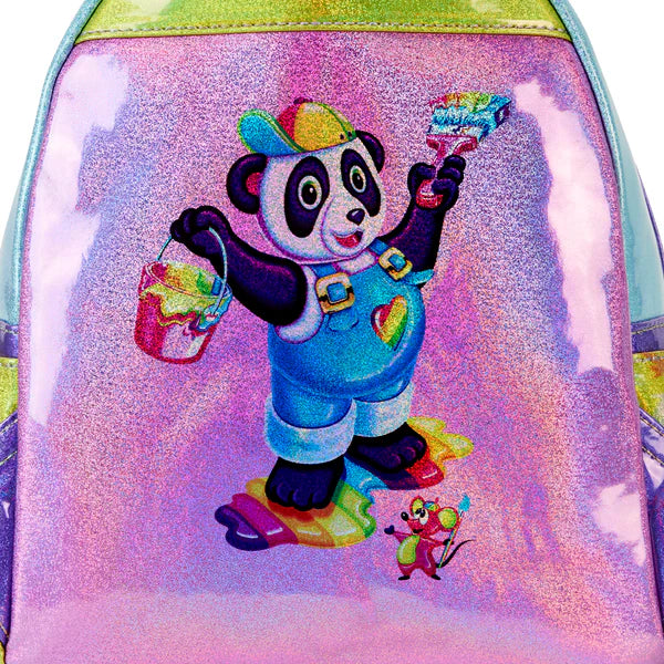 Get in touch with your inner child with this nostalgic Lisa Frank holographic color block mini backpack from Loungefly! On the front you'll see Dalmatians Spotty & Dotty holding a paint brush. You can find Markie prancing in front of a rainbow with a butterfly on the front pocket which you can open with a rainbow heart zipper charm. The side pockets of the bag feature a golden retriever playing with ball on one side and the aliens Zoomer & Zorbit on the other. On the back you can find Panda Painter standing in a puddle of rainbow paint and the interior features all over print of Lisa Frank's logo and the iconic rainbow heart.
