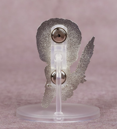 - Pin is displayed on a custom Nendoroid stand with protective backing